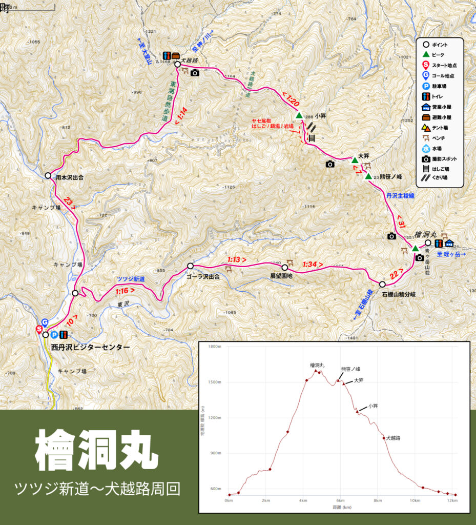 西丹沢ビジターセンターから登りはツツジ新道を使い檜洞丸まで、そのあとは丹沢主稜線で犬越路まで行き、東海自然歩道で用木沢出合へ下るルートです。ツツジ新道はゴーラ沢出合で軽く渡渉がり、急こう配になりますが、天然のステップがあるので歩きにくくはないです。小笄(ここうげ)近辺はヤセ尾根、岩場、鎖場、はしごが連続しています。