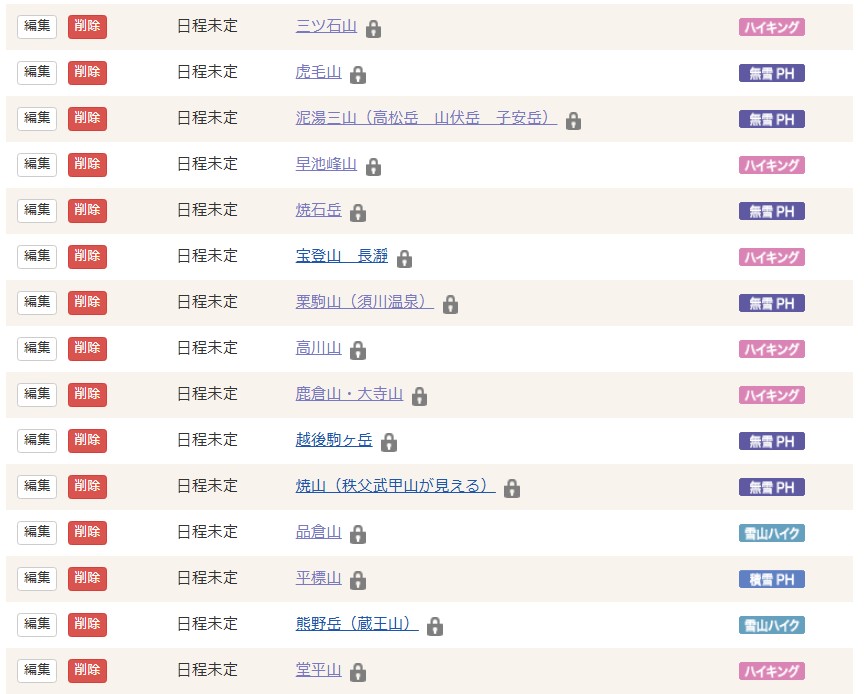 「家から日帰りで行こう」「一泊二日で2座まとめていこう」「この2座はテント泊で縦走」などある程度イメージができているものは山行計画などにメモしておきます。