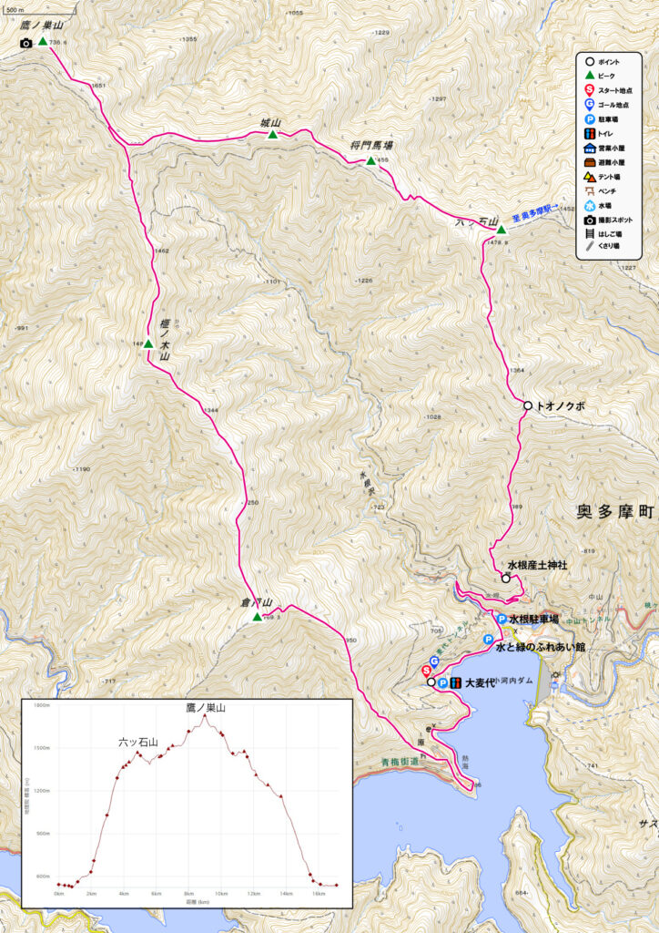 大麦代を出発して、水根から棒ノ木尾根で六ツ石山を経由し鷹ノ巣山へ、帰りは榧ノ木尾根ルートで降りてきます。